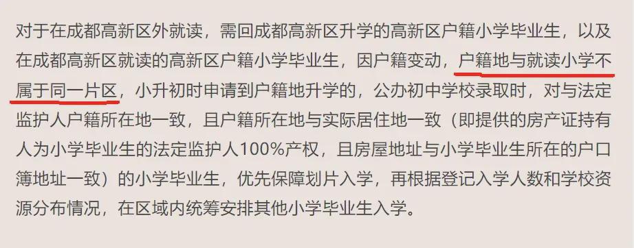 高新区的小升初计策中就明确提到,因为户籍变动导致户籍与学籍不在统一个片区的情况,要在户籍地升学的话,优先保险恰当“两个一致”的娃娃划片入学,其他娃娃再统筹入学。